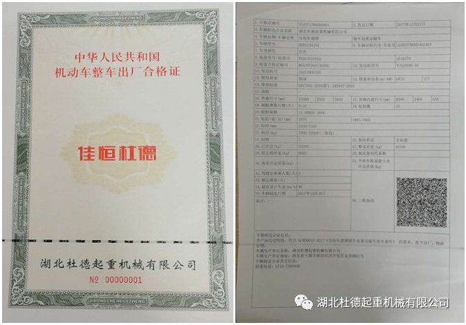 2018年初,湖北杜德起重機械有限公司完成第一臺專用車型公告,這標志著湖北杜德起重機械有限公司有屬于自己的整車合格證了,向整車改裝行業邁進了極為重要、堅實的一步!