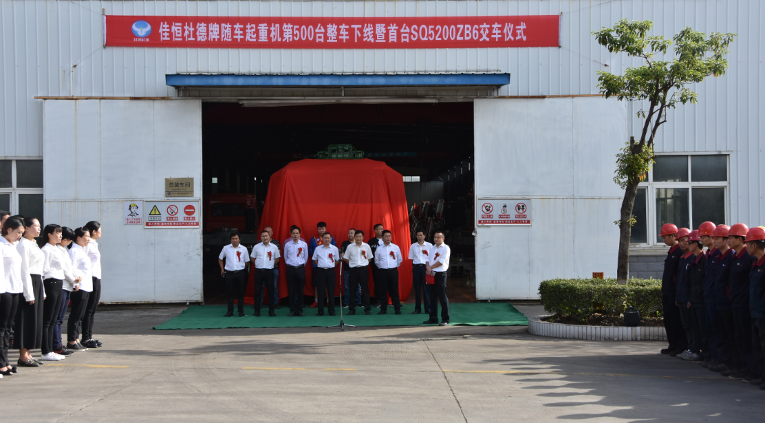 金秋九月,丹桂飄香,在這樣一個豐收的時節里,恰逢湖北杜德起重機械有限公司第500臺隨車起重機暨首臺SQ5200ZB6生產下線,舉行隆重的交付儀式。