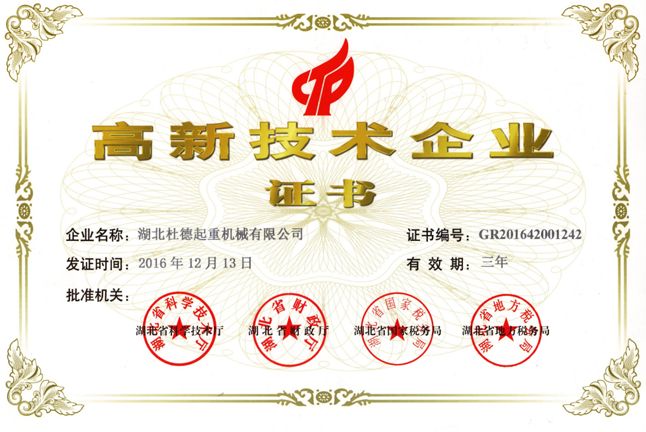 陽春三月,生機盎然,伴隨著來自全國各地紛至沓來的訂單,湖北杜德起重機械有限公司又傳喜訊佳音----根據國家《高新技術企業認定管理辦法》的相關規定,憑借專業的研發