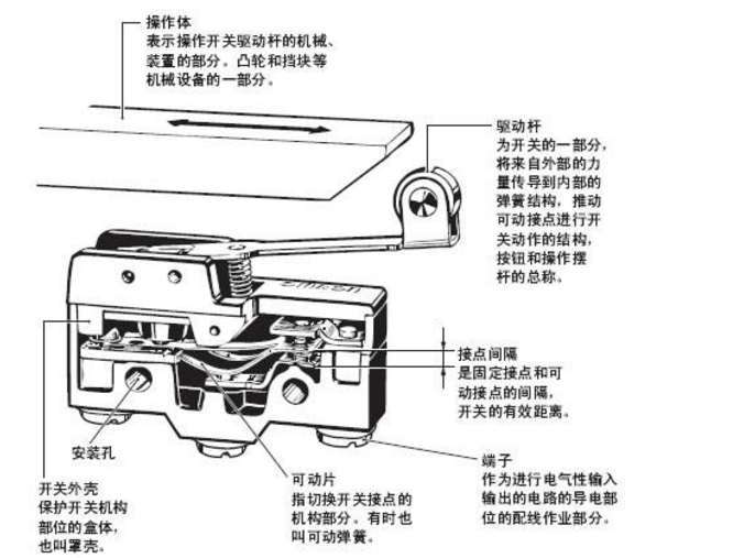 微動開關具有微小接點間隔和速動機構,用規(guī)定的行程和力進行開關動作的接點機構,被外殼覆蓋, 其外部有傳動器,且外形較小。下圖為典型的微動開關構造的一個示例。