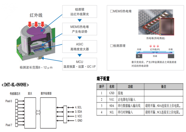 熱電堆紅外傳感器,就是利用貝塞克效應(yīng),內(nèi)部由兩個(gè)或多個(gè)熱電偶串聯(lián)組成熱電堆芯片,通過(guò)吸收物體表面的紅外輻射,當(dāng)目標(biāo)溫度與參考溫度存在溫度差時(shí),熱電偶產(chǎn)生的熱電動(dòng)勢(shì)互相疊加并輸出對(duì)應(yīng)溫度的電壓信號(hào)。這樣,使用熱電堆測(cè)量溫度時(shí),一來(lái)可以克服單個(gè)熱電偶產(chǎn)生的電勢(shì)差太小而難以測(cè)量的缺點(diǎn),二來(lái)可以避免使用價(jià)格較高的精度運(yùn)算放大器。目前市面上熱電堆傳感器主要有模擬輸出型及數(shù)字輸出型這兩種類型,模擬輸出型雖然內(nèi)部結(jié)構(gòu)簡(jiǎn)單且價(jià)格便宜, 但電路設(shè)計(jì)時(shí)需要考慮的問(wèn)題較多,除了需要搭配低溫漂的運(yùn)放+高精度ADC, 還要考慮低功耗、高SNR信噪比及電路穩(wěn)定性等等,這些對(duì)研發(fā)人員來(lái)說(shuō)是一項(xiàng)不小的挑戰(zhàn)。而歐姆龍D6T系列熱電堆紅外傳感器, 內(nèi)置ASIC+高精度運(yùn)放,通過(guò)內(nèi)置MCU進(jìn)行AD轉(zhuǎn)換及信號(hào)處理,可通過(guò)I2C數(shù)字接口獲取溫度數(shù)據(jù)。這樣不僅測(cè)溫電路穩(wěn)定性有保障,也大大縮短了產(chǎn)品開(kāi)發(fā)周期,一定程度上也節(jié)省了開(kāi)發(fā)成本。