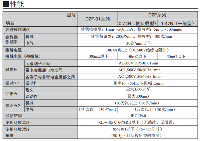 歐姆龍微動開關(guān)D2F系列產(chǎn)品性能: