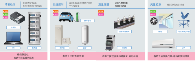 燃氣混合比控制、燃氣消耗量測量,如:家用燃料電池、熱式煤氣表、熱水器