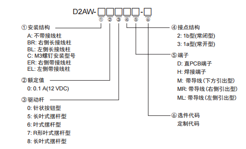 歐姆龍D2AW微動(dòng)開(kāi)關(guān)具有小型的外觀(guān)尺寸,并且根據(jù)安裝結(jié)構(gòu)、額定值、驅(qū)動(dòng)桿類(lèi)型、節(jié)點(diǎn)結(jié)構(gòu)、端子以及定制代碼的不同,可提供多種型號(hào)產(chǎn)品,以便客戶(hù)根據(jù)實(shí)際應(yīng)用需求進(jìn)行選擇。