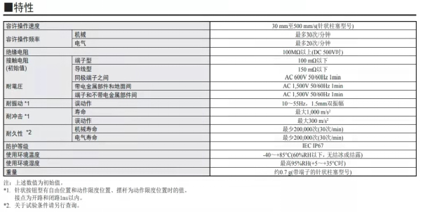 歐姆龍D2AW微動(dòng)開(kāi)關(guān)的機(jī)械壽命和電氣壽命均為至少200,000次(30次/min),符合IEC IP67防護(hù)等級(jí),在60%RH以下、無(wú)結(jié)冰或結(jié)露的情況下,能夠在-40℃~+85℃的溫度范圍內(nèi)工作,而在最高95%RH的環(huán)境中,能夠在+5~+35℃的溫度范圍內(nèi)工作。不僅如此,該開(kāi)關(guān)還具有很強(qiáng)的耐電壓性和耐沖擊性,可適用于工作條件較為嚴(yán)苛的環(huán)境中。