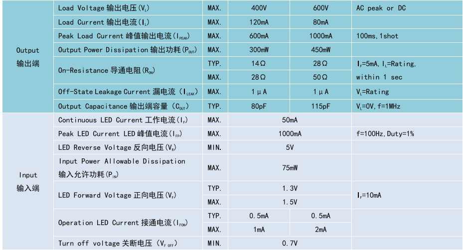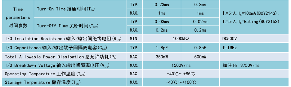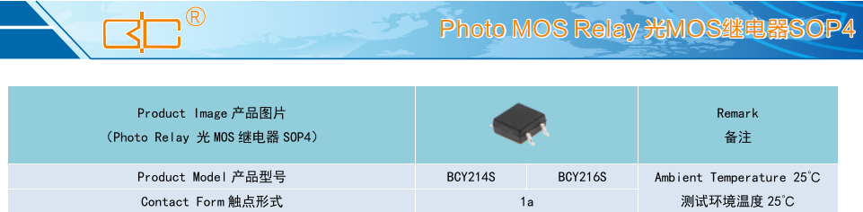 (Relay 光 MOS 繼電器 SOP4),Product Model產(chǎn)品型號(hào):BCY214S/BCY216S,Contact Form觸點(diǎn)形式:1a,Ambient Temperature 25°C,測(cè)試環(huán)境溫度 25°C