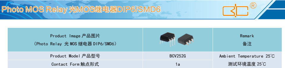 (Relay 光MOS 繼電器 DIP6/SMD6),Product Model產(chǎn)品型號:BCV252G,Contact Form 觸點形式:1a,Ambient Temperature 25C測試環(huán)境溫度 25°C