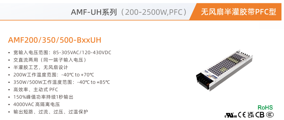 開關電源半灌膠AMF-UH系列 (200-2500W, PFC)