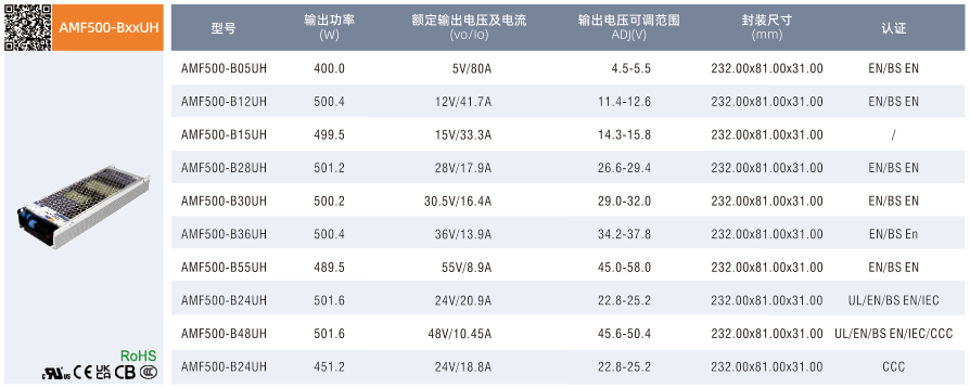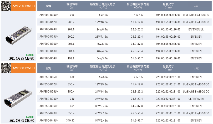AMF200/350/500-BxxUH, ·寬輸入電壓范圍:85-305VAC/120-430VDC ·交直流兩用(同一端子輸入電壓) ·半灌膠工藝,無風扇設計 ·200W工作溫度范圍:-40°Cto+70C ·350W/500W工作溫度范圍:-40to+85℃ ·高效率、主動式 PFC ·150%峰值功率持續1秒輸出 ·4000VAC高隔離電壓 ·輸出短路、過流、過壓、過溫保護