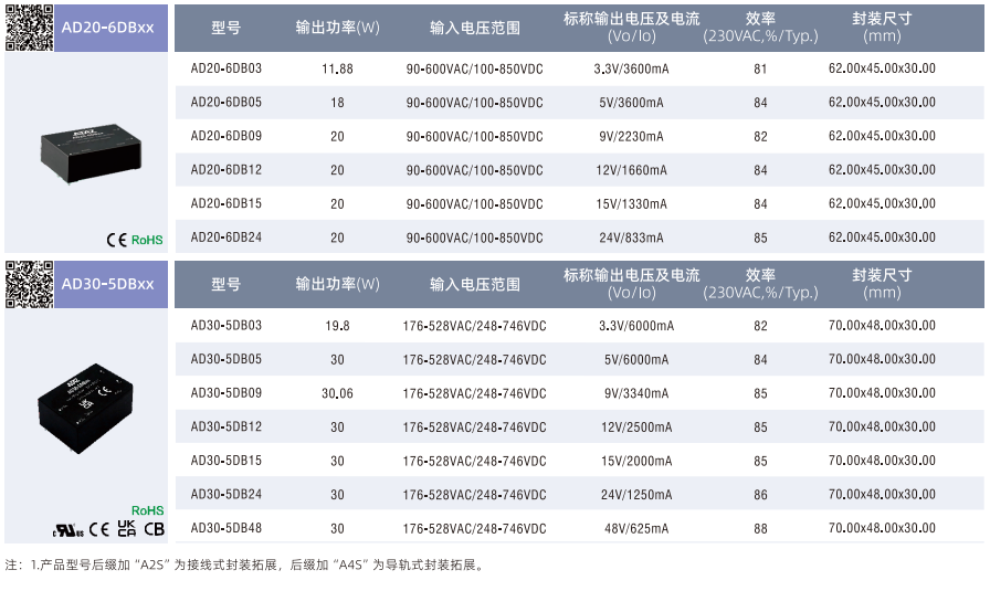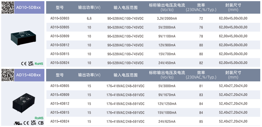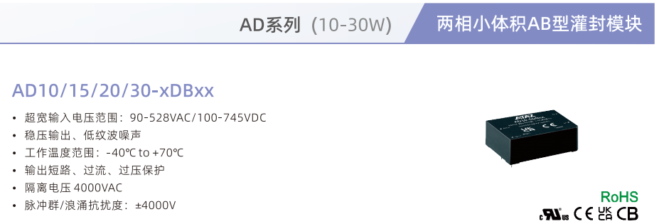 小體積灌封模塊電源AD10/15/20/30-xDBxx ??超寬輸入電壓范圍:90-528VAC/100-745VDC ??穩(wěn)壓輸出、低紋波噪聲 ??工作溫度范圍:-40°℃to +70C ??輸出短路、過流、過壓保護(hù) ??隔離電壓 4000VAC ??脈沖群/浪涌抗擾度:±4000V