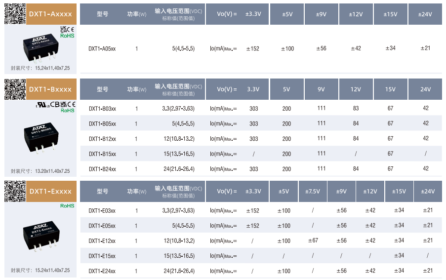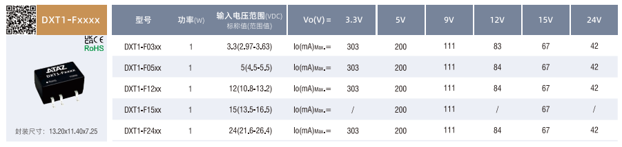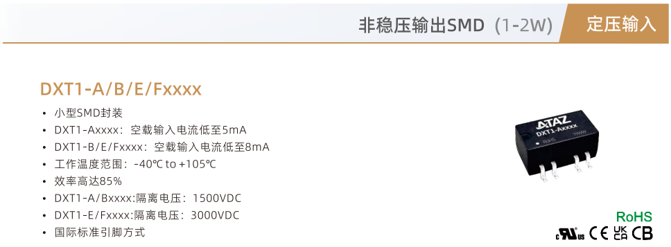 非穩壓輸出SMD(1-2W)??DXT1-A/B/E/Fxxxx ??小型SMD封裝 ??DXT1-Axxxx:空載輸入電流低至5mA ??DXT1-B/E/Fxxxx:空載輸入電流低至8mA ??工作溫度范圍:-40°℃to+105°C ??效率高達85% ??DXT1-A/Bxxxx:隔離電壓:1500VDC ??DXT1-E/Fxxxx:隔離電壓:3000VDC ??國際標準引腳方式