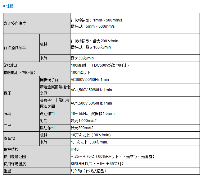 ? ??*1 在針狀按鈕型中為自由位置和動(dòng)作極限位置的值,在擺桿型中為動(dòng)作極限位置的值。接點(diǎn)的閉路或開路動(dòng)作小于1ms。 ? ??*2 關(guān)于試驗(yàn)條件請(qǐng)另行查詢。