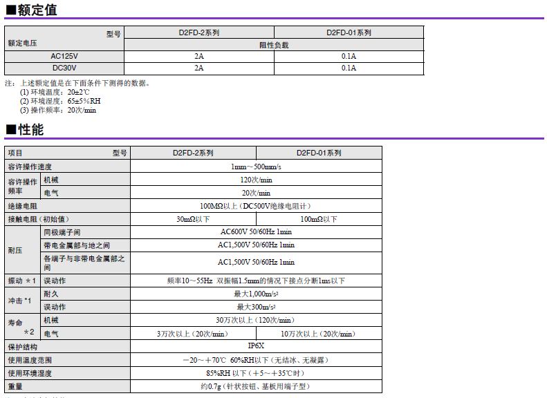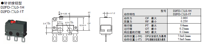 D2FD-2 超級小型基本開關 兼具防塵功能的極超小型基本開關 利用橡膠封裝的密封結構實現防塵 (IEC IP6X)。可在有灰塵、紙粉的環境下使用。 可動片為1片彈簧構造,支持AC125V 2A開關,更有微小負載型可供選擇。 還備有焊接、印刷基板用端子。