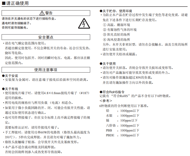 接點(diǎn)間隔3mm以上的小型電源開關(guān) 采用特定的速斷機(jī)構(gòu),可進(jìn)行功率負(fù)載開、閉。開、閉利落、良好的操作感。 確保接點(diǎn)間隔3mm以上。 符合UL、cUL標(biāo)準(zhǔn)、符合EN標(biāo)準(zhǔn)。