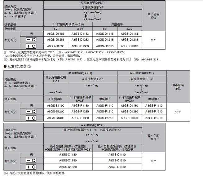 A8GS 遠(yuǎn)程復(fù)位 船形開關(guān) 帶復(fù)位功能船形開關(guān) 利用基于外部信號的 “復(fù)位功能”關(guān)閉電源開關(guān),設(shè)備的待機(jī)功率為零。 適用于浪涌較大的負(fù)載的電源ON/OFF。適用于TV-8(浪涌特性117A)。 備有適用于微小負(fù)載領(lǐng)域的接點(diǎn)構(gòu)造種類。 備有可同時(shí)ON/OFF微小負(fù)載領(lǐng)域、高負(fù)載領(lǐng)域的2極規(guī)格種類。 接點(diǎn)間隙大于3mm。 取得UL、cUL標(biāo)準(zhǔn)認(rèn)證,并符合EN標(biāo)準(zhǔn)。