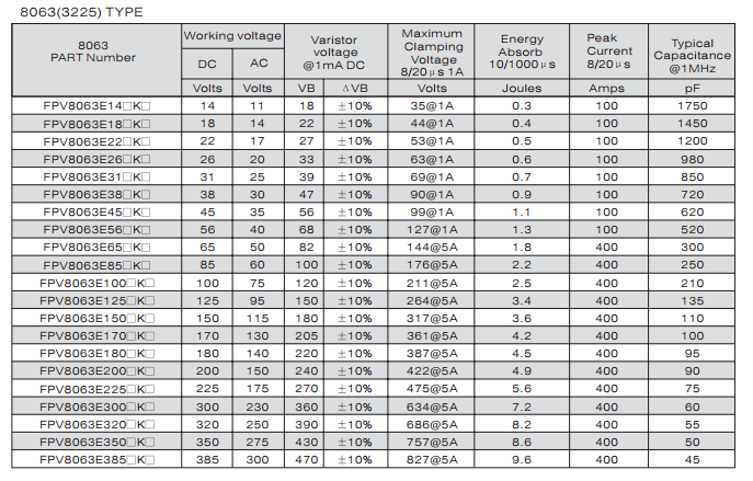 特征: 1、疊層片式陶瓷結(jié)構(gòu)。 2、無(wú)引線(xiàn)。 3、溫度范圍:-55℃~+125 ℃。 4、工作電壓范圍V w(dc)=3.3~ 615V。 5、具有雙向限制特性,適合ESD保護(hù)。 6、漏電流非常小。 7、寄生電感小、響應(yīng)速度快(響應(yīng)時(shí)間少于0.5ns)。 8、優(yōu)良的溫度系數(shù)。 9、良好的焊接性能(端電極為三層電鍍)。 應(yīng)用: 1、防止過(guò)電壓:當(dāng)施加的電壓升高到壓敏電壓時(shí),壓敏電阻器的電流急劇上升,被保護(hù)設(shè)備的浪涌電壓迅速減小,從而使裝有壓敏電阻器的設(shè)備抗浪涌噪聲能力達(dá)到相應(yīng)要求。